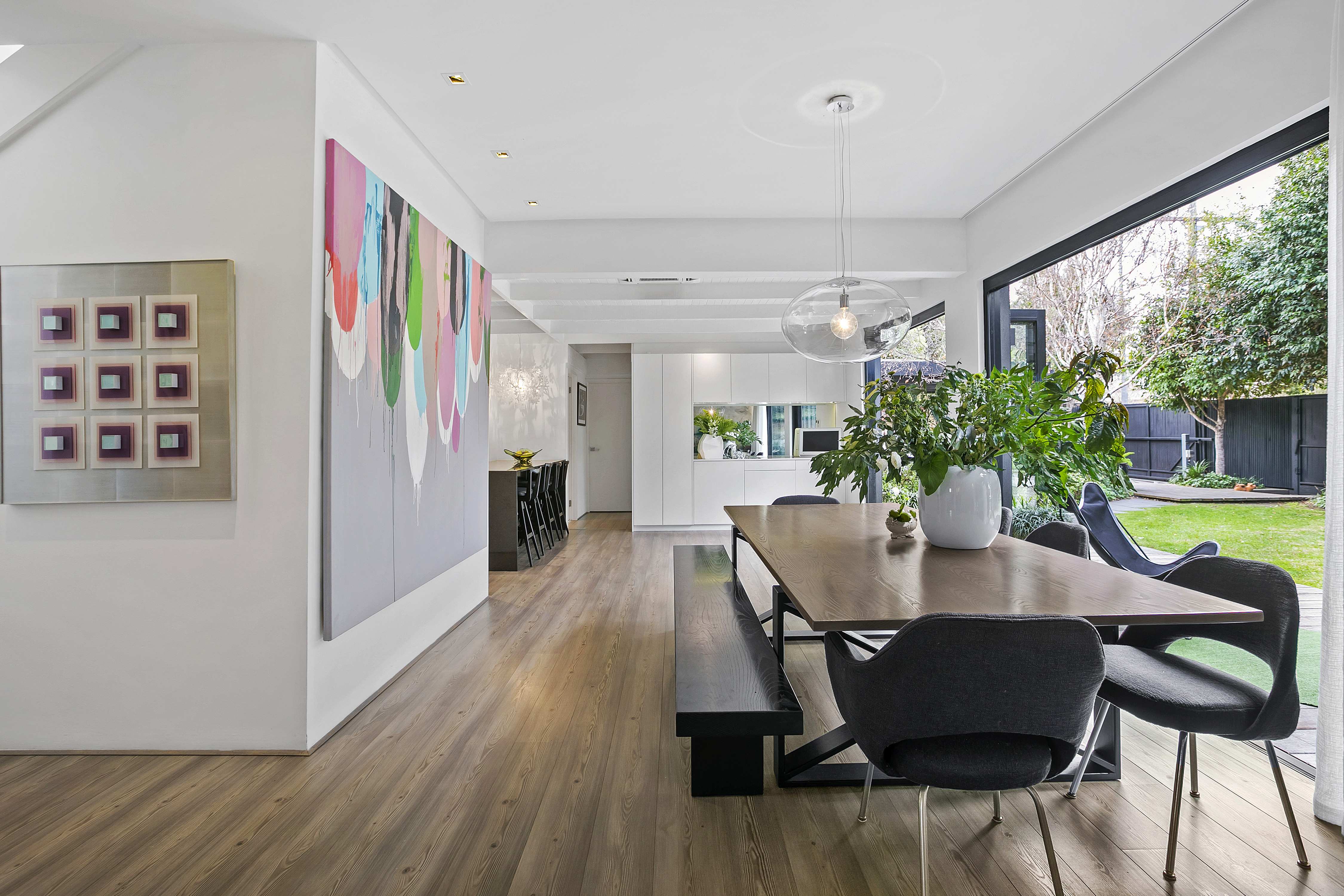 Danielle Balscheit arranging white flowers in a glass vase on a black dining room table with a large painting on one wall and the other a large window into a garden